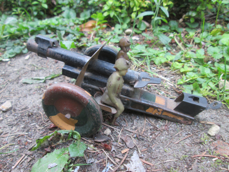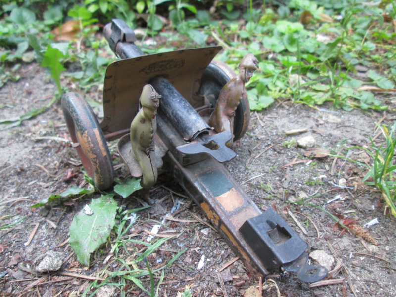 Tin canon with tin soldiers on it. French made VEBE. Franse makelij blikken speelgoed kanon met daarop blikken soldaten vroeg stuk speelgoed camouflage gemaakt.
