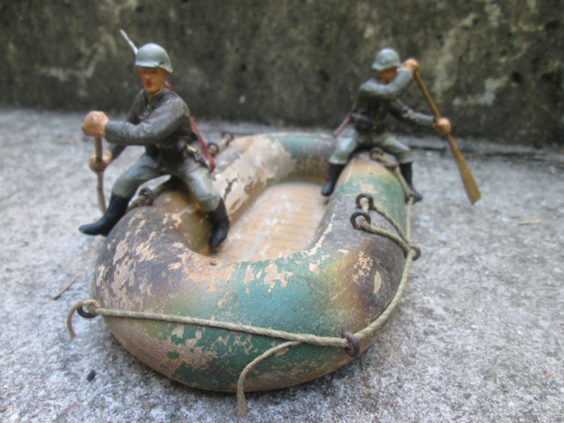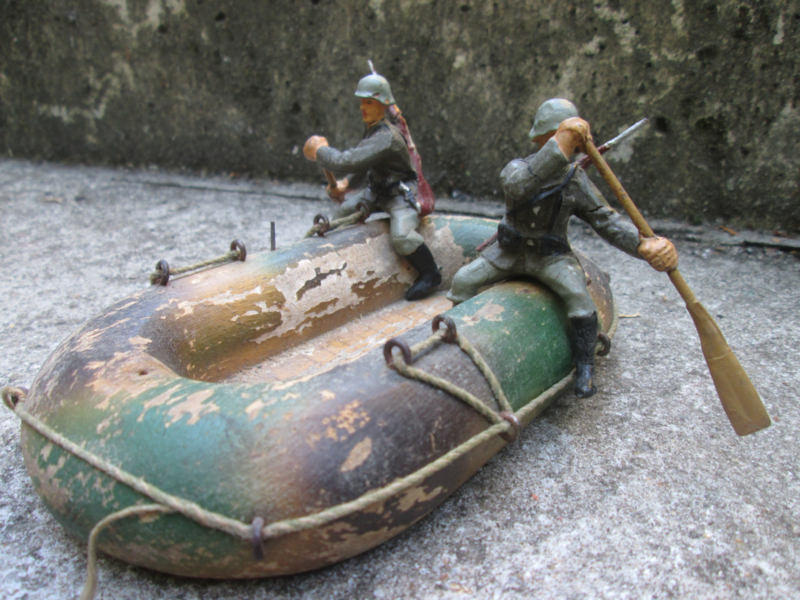 2 German soldiers on wooden boat with camouflage. 2 Duitse soldaten pioniers met peddels in een camouflage boot mooi geheel leuk apart item TOP