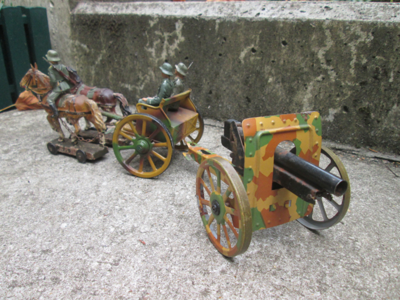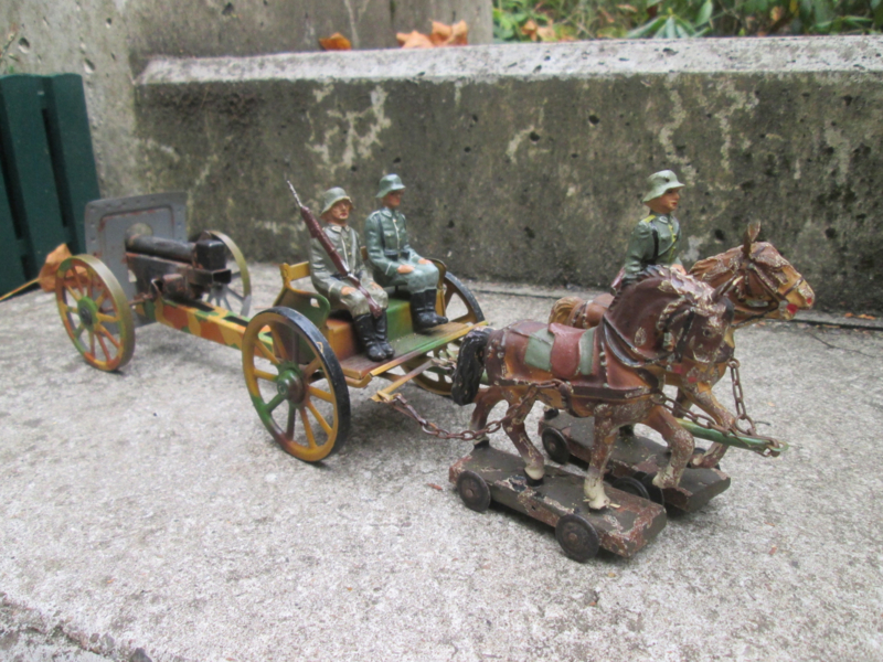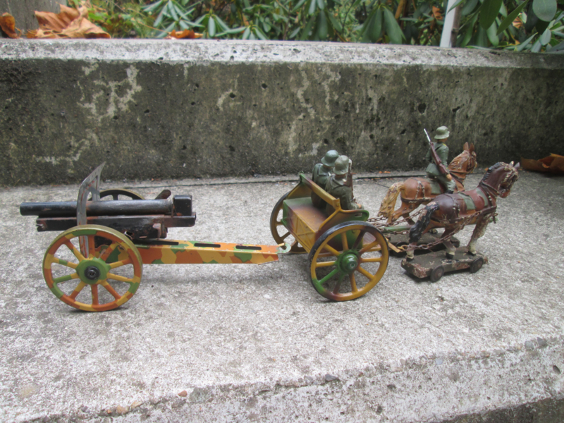 Tippco German cavalery with horses and a canon. Tippco Blikken kar met kanon getrokken door paarden met 3 Duitse militairen. leuk geheel.