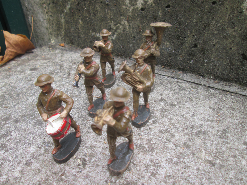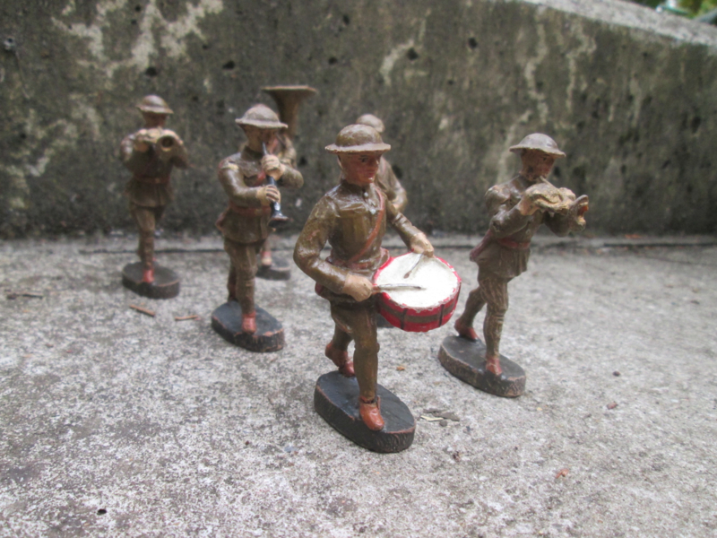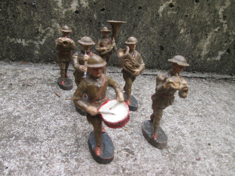 ELASTOLIN 6 British soldiers playing music. 6 Engelse soldaten drumband ongemarkt,