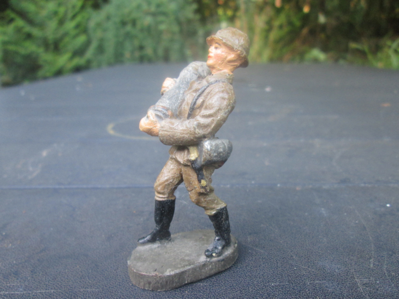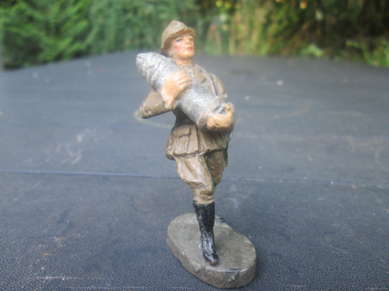 ELASTOLIN Belgium soldier carrying a shell. Belgische soldaat draagt een kanon kogel.