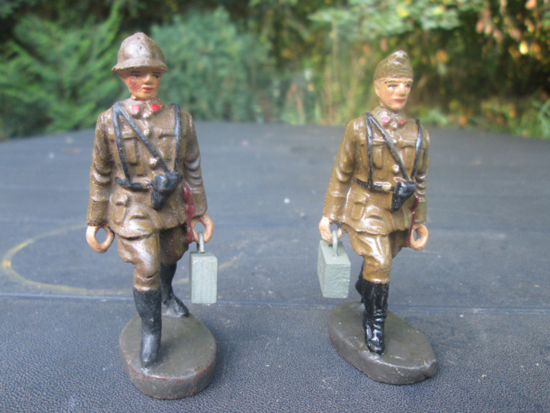 ELASTOLIN 2 Belgium soldiers carrying ammo boxes. 2 Belgische soldaten dragen munitiekisten,