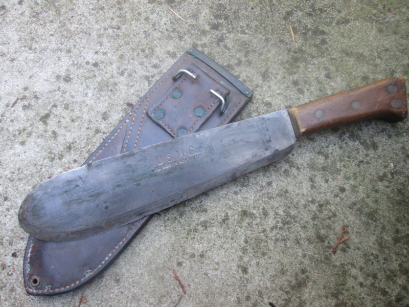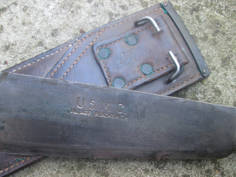 US WW2 USMC hospital corpsman bolo knife 1943 dated. Amerikaans kapmes USMC Marine Corps 1943 gedateerd in gemarkeerde schede leuk item.
