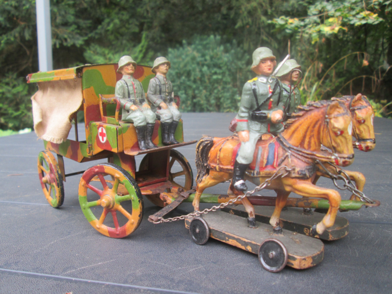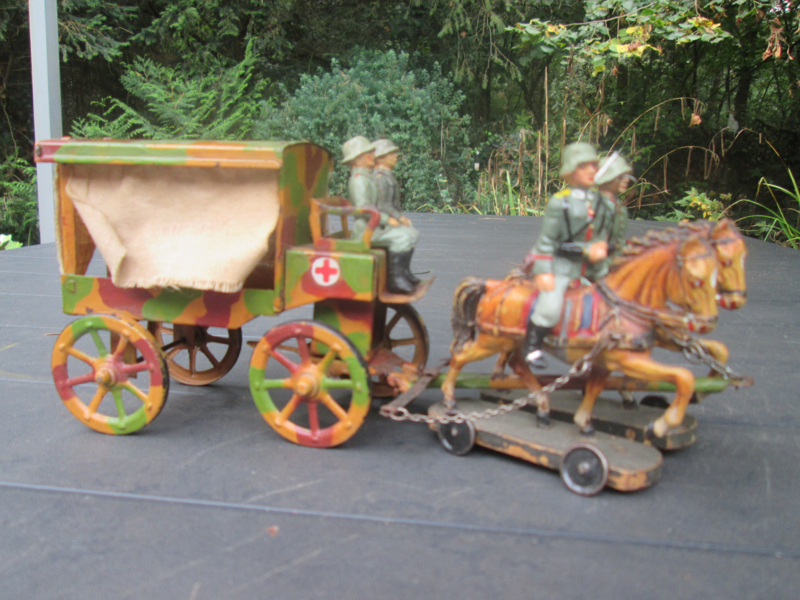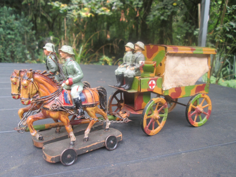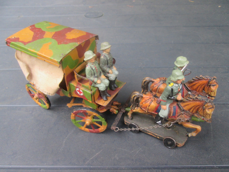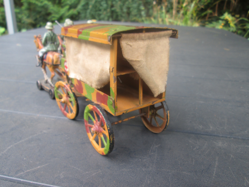Tippco tin red cross ambulance with horses and German soldiers. blikken rode kruis huifkar met paarden en Duitse soldaten, zeer goede staat.