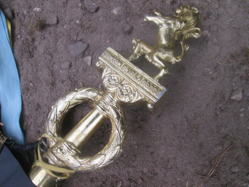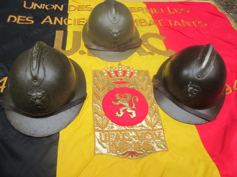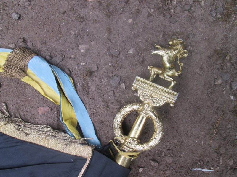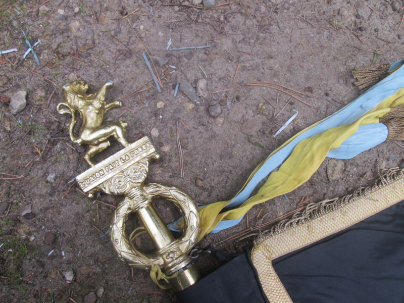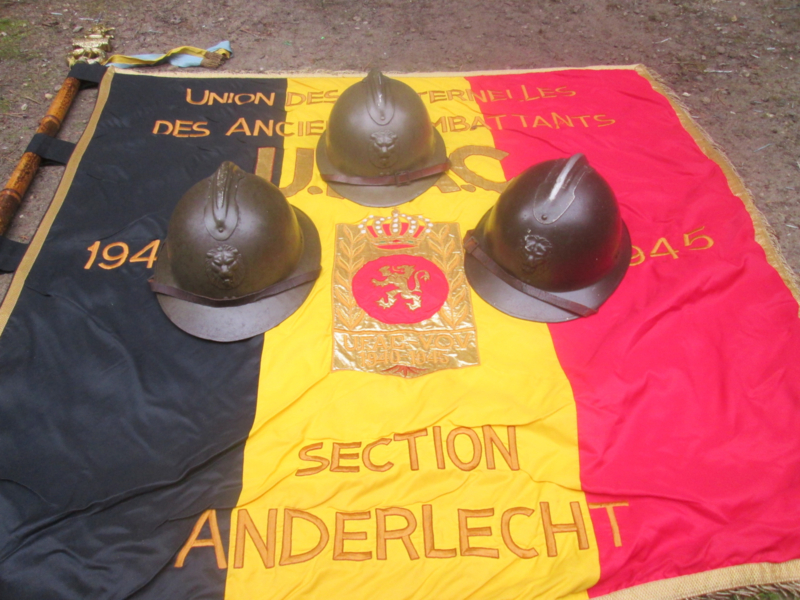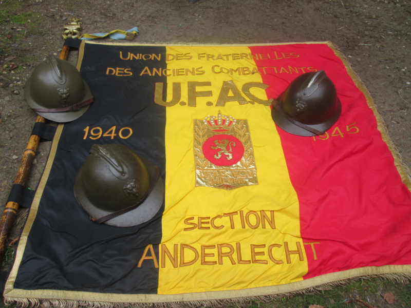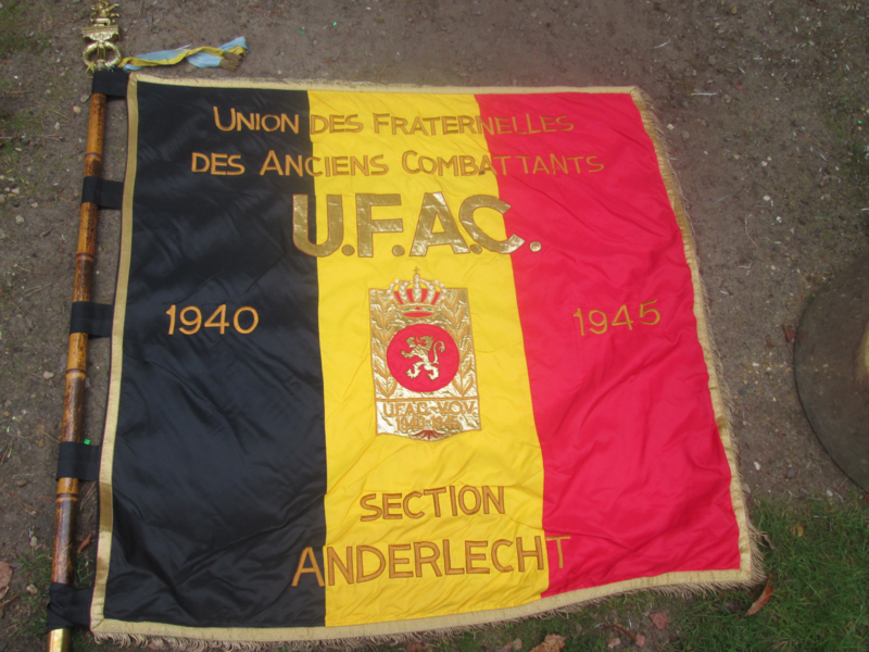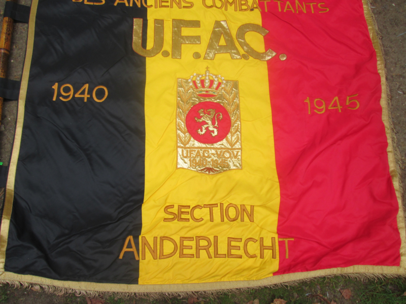 Belgische oudstrijders verenigings vlag van Anderlecht zeer goede staat compleet met metalen leeuw en bamboevlaggenstok.