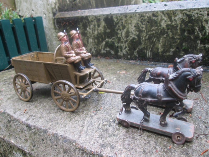 Belgische soldaten met voorraadwagen en twee paarden zeer goede staat.