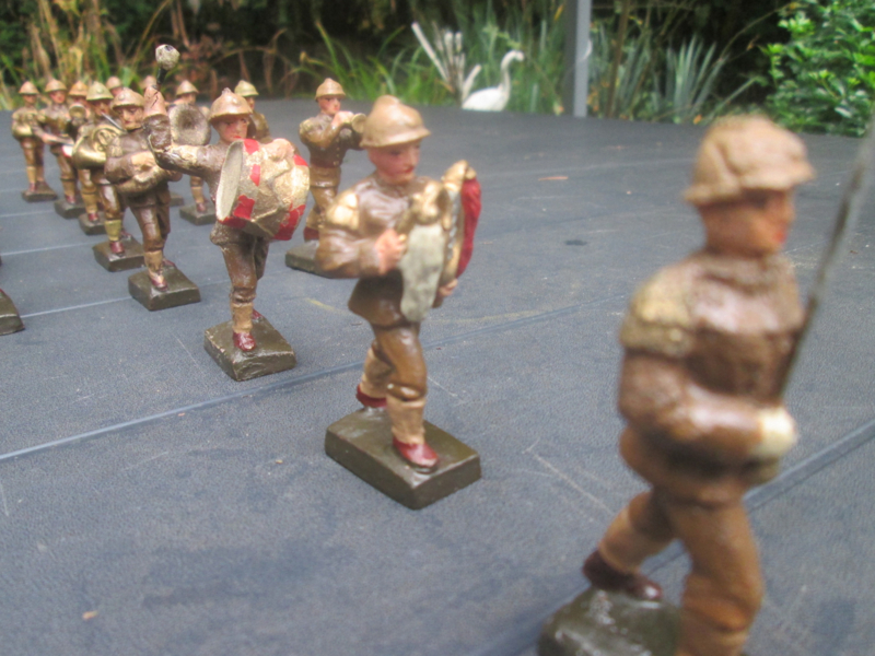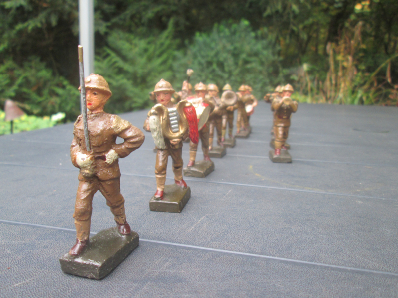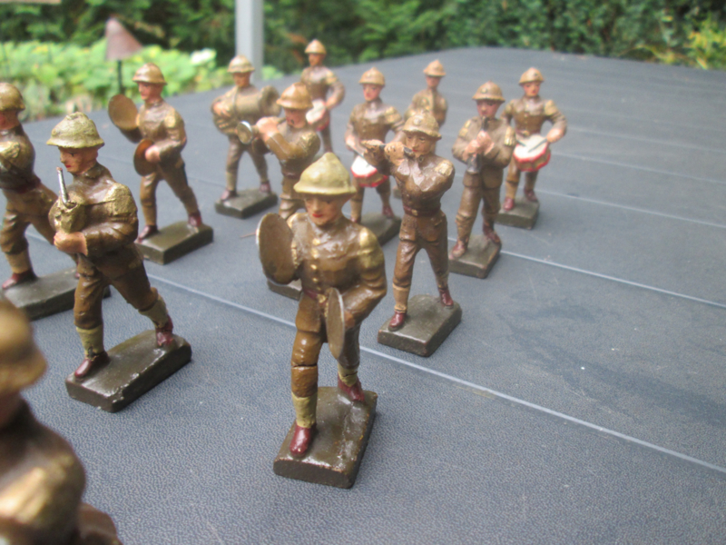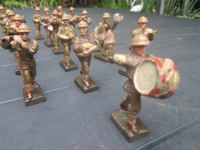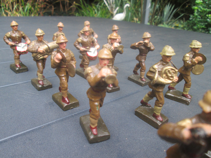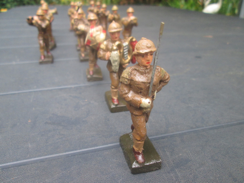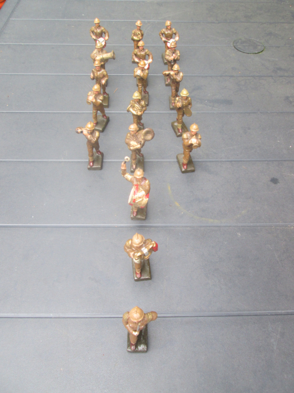 LINEOL Belgium soldiers drumband smaller size. 15 Belgische soldaten drumband 1 met lyra. kleiner model soldaatjes bijzonder apart.