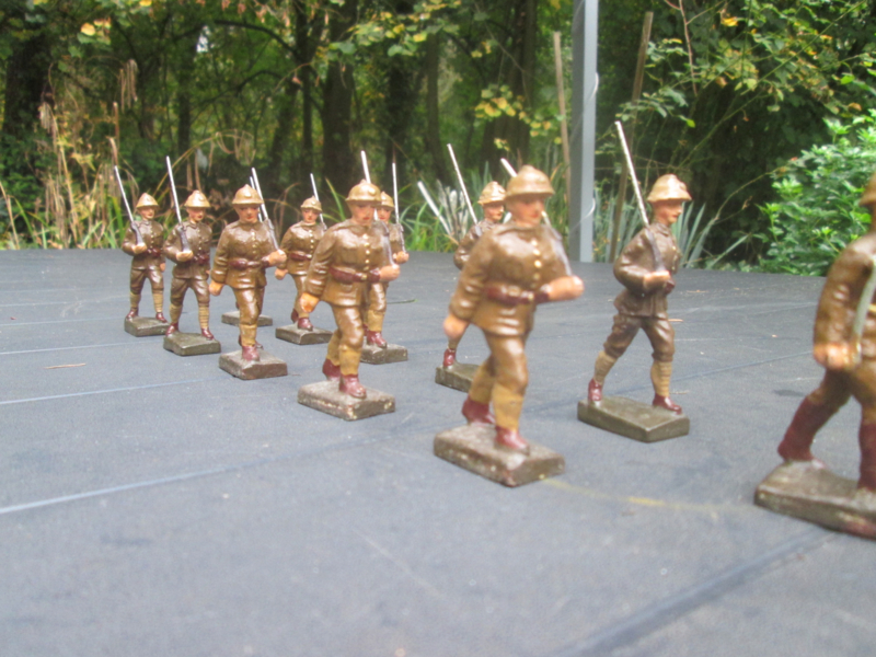 LINEOL 11 Belgium soldiers marching, smaler size. 11 marcherende belgische soldaten goede staat kleiner model.
