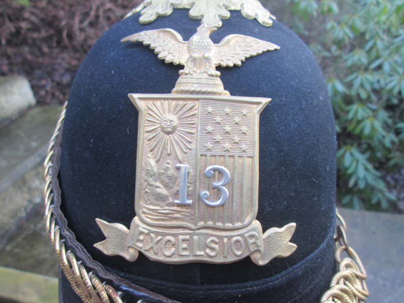 US cloth helmet M1860 New/York National Guard Excelsior Brigade 1861/1864 Pinhelm Amerikaanse helm vuurverguld beslag nette staat bijzonder stuk.