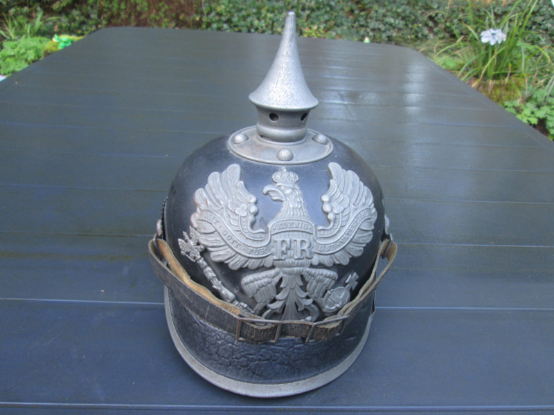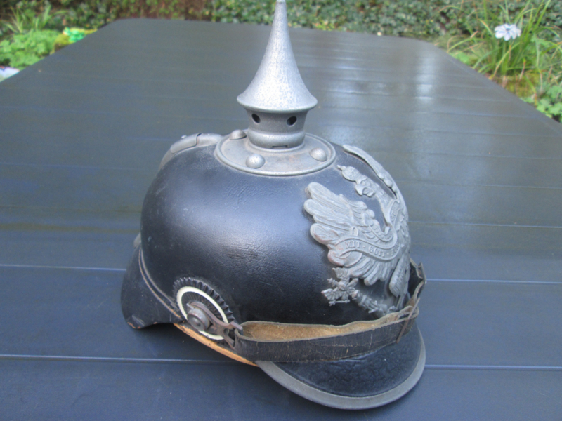 German Pickelhaube spike helmet Prussian Infantry M1915. Duitse pickelhaube Pruisen veldgrijs manschap met afneembare spits mooi gemarkeerd 1916 ronde stempel.