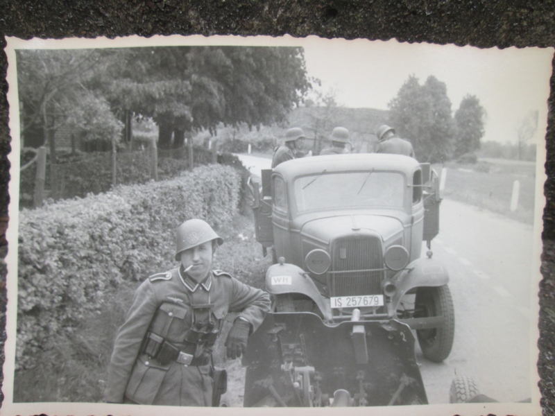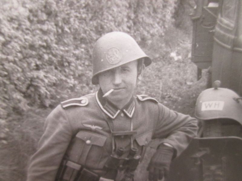 Photo German soldier wearing a Dutch helmet. Foto uit Russisch archief, Duitse soldaat met Nederlandse helm als oorlogs buit.