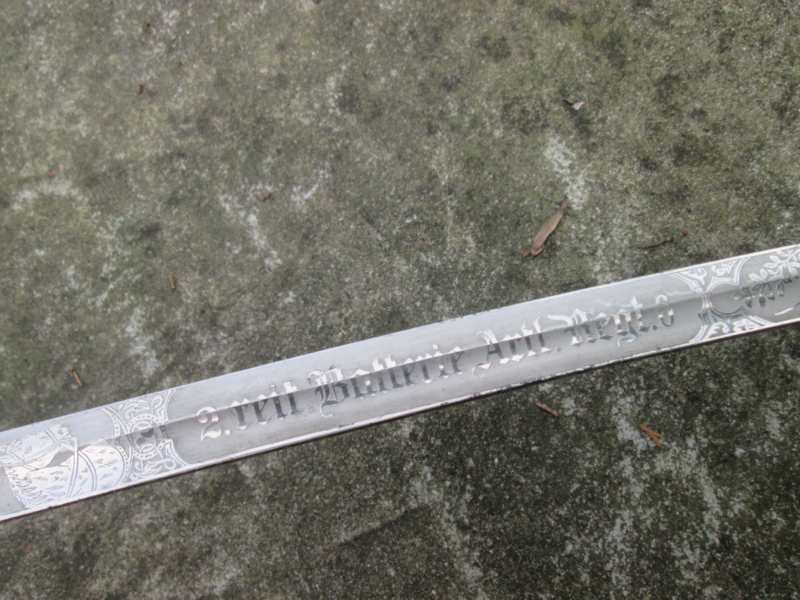 German Wehrmacht sword etched blade. Duits Wehrmacht sabel met gegraveerd lemmet . 2.Reit. Batterie artl. Reg. 6 compleet met troddel en leren drager TOP. rode steentjes in leeuwenkop.
