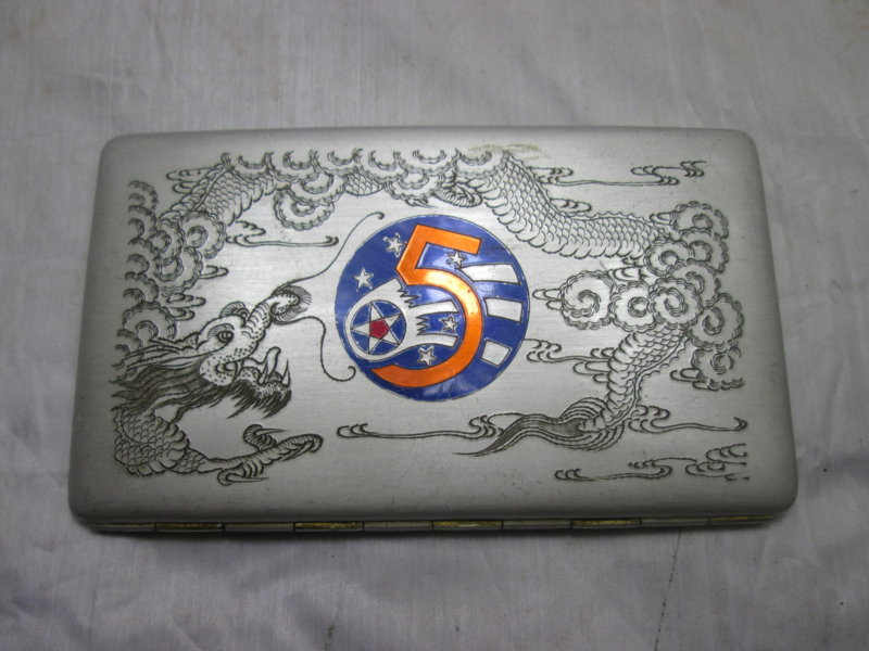 US-Air Force cigarette case 5th Bomber unit Pacific Air Force Yokota Air base Japan 1941. Amerikaanse luchtmacht sigaretten doos met 5th bomber embleem en draak. gestart in 1941.