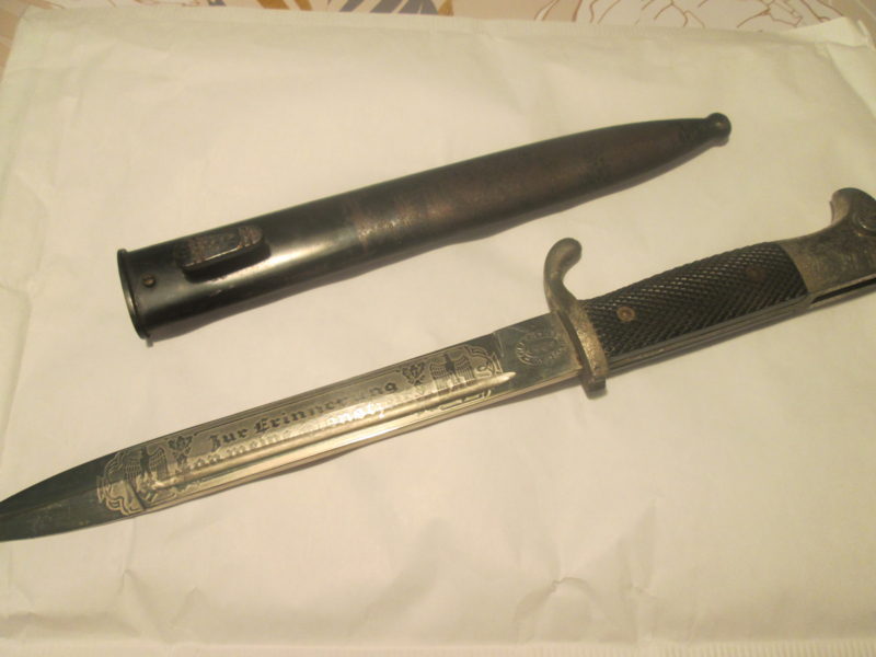 GAS€ 945,00 - German k-98 Mauser bayonet matching numbers. with leather frog, nicely marked and dated.Duitse Mauser bajonet nummer gelijk. zeer nette staat.